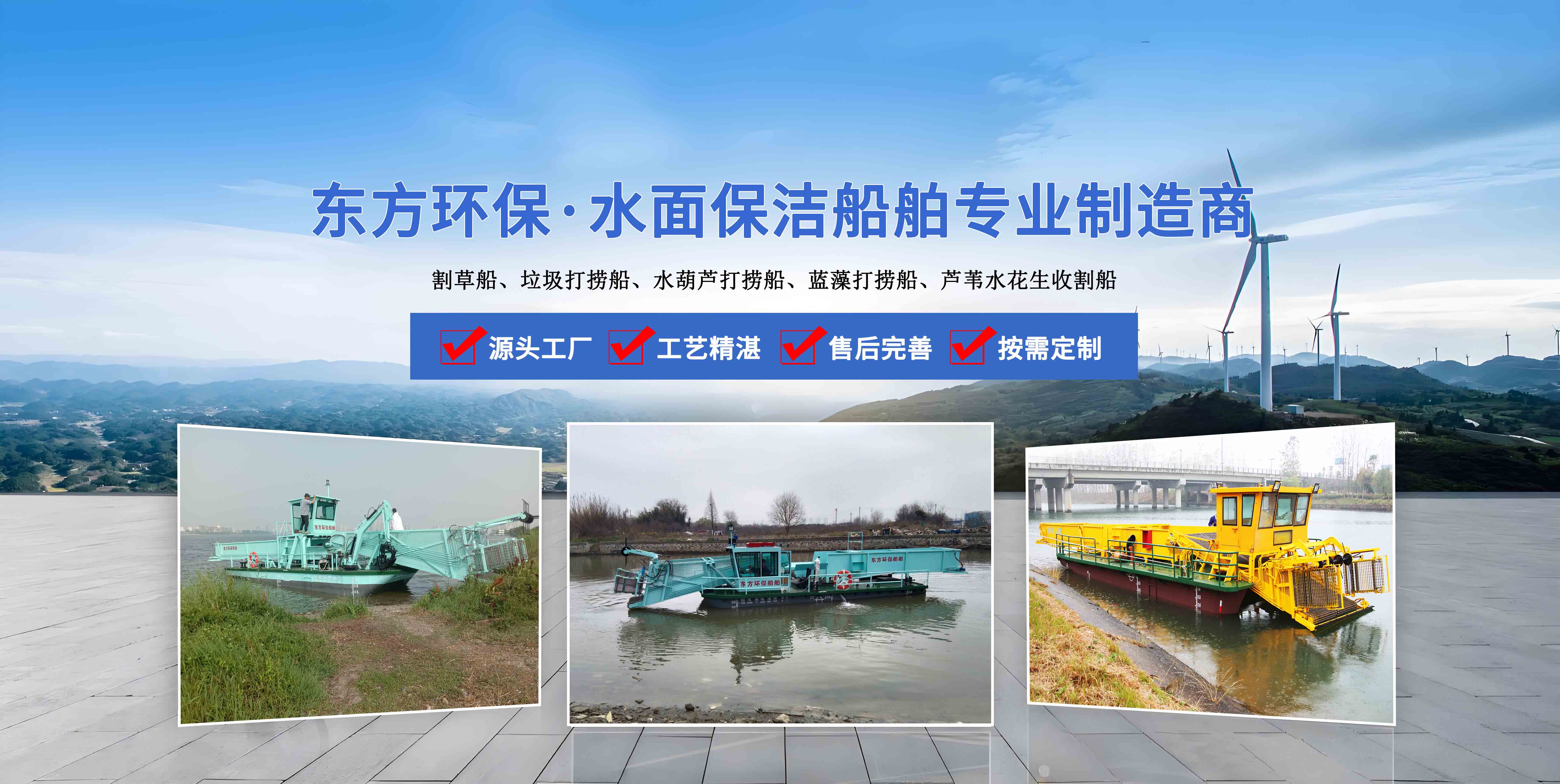 東方船舶是集研發、生產、服務為一體的現代化企業,產品十幾種系列 主營業務:清潔船、水草收割船、垃圾打撈船、水面保潔船等